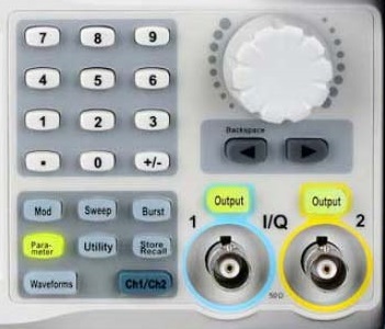 На передней панели генераторов находится цветной сенсорный жидкокристаллический дисплей, на котором отображается форма генерируемого сигнала и его параметры. Управление режимами работы, выбор регулируемых параметров, включение и отключение выходов генераторов осуществляется с передней панели специальными кнопками. Для ввода цифровых параметров на панели имеется три группы органов управления: кнопки направлений (со стрелками), вращающийся регулятор параметров и цифровая клавиатура. В нижней правой части панели расположены выходные разъемы двух основных каналов.